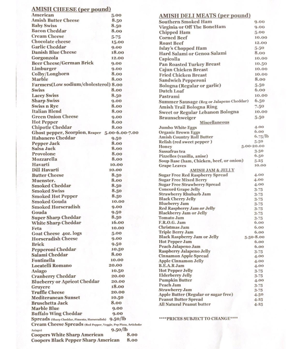 Valley Cheese Co. lives up to its name by offering a wide variety of cheeses in our deli. Each of our roughly 65 varieties of Amish cheese is available for purchase and is sliced to order. Purchase your favorite by the pound, try it on a sandwich with one of our delicious deli meats, or try a sampler platter of a few different cheeses and meats. We also offer a variety of Amish-style deli meats, as well as Amish-made jams, so no matter what you want to put on your sandwich, we have you covered. Check out our list of cheeses meats, and jams, then stop by today to grab your favorites!