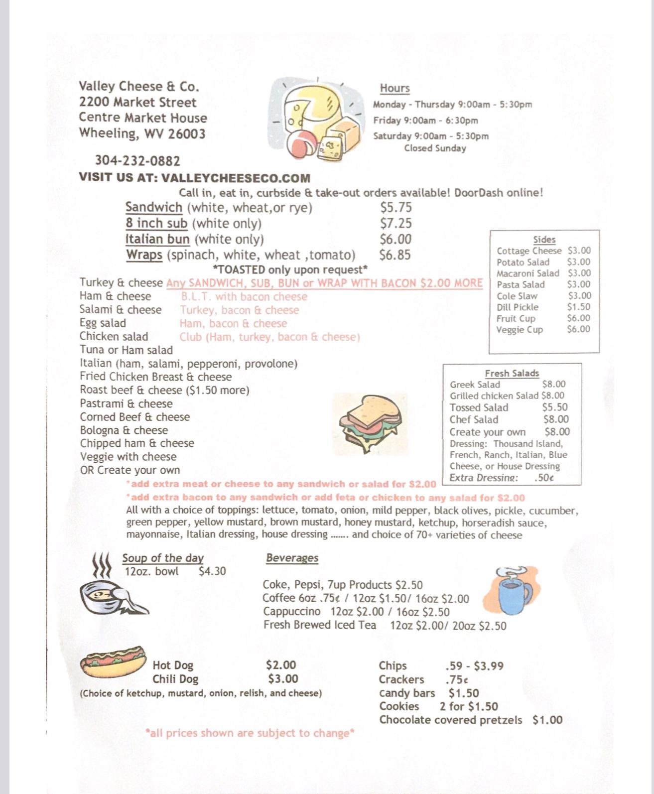 If you live or work in Wheeling near Centre Market, stop by Valley Cheese Co. for your next meal! We offer a variety of sandwiches, soups, salads, and sides at our deli counter. We like to keep our prices low, so you can always afford to stop by on your lunch break and try something different. Our case is filled with approximately 85 varieties of meats and cheeses that make perfect sandwiches, so you can always find something you love, or something you have never tried before. We also offer daily specials and a soup of the day, so no matter when you stop by, you will always find something different.